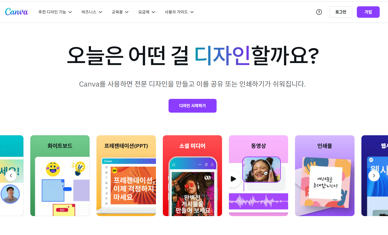 디자인 작업에 익숙하지 않은 일반 사용자에게도 매우 직관적인 UI를 제공하며, 드래그 앤 드롭 방식으로 편집이 가능해 작업 속도가 빠릅니다. 무료 요금제로도 기본 기능은 충분히 활용할 수 있으며, 유료 요금제에서는 더 많은 템플릿과 고급 편집 기능을 제공합니다.